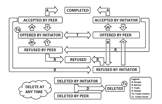 A trade may have an infinite number of iterations and is only completed upon double confirmation from both parties. The double confirmation concept is based on successful consecutive acceptation of the terms of the agreement (transaction) by both parties.